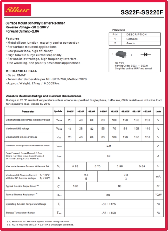 slkor萨科微肖特基二极管SS24F的性能指标犹如坚实的基石,为电路的稳定运行提供了可靠保障。