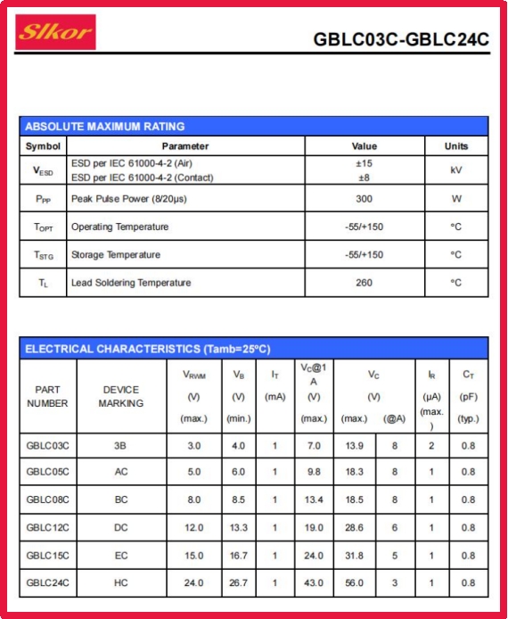 在实际应用中,GBLC05C系列展现出多项卓越特性。其工作电压范围覆盖3V至24V,包括3V、5V、8V、12V、15V和24V多种规格,能满足不同电路设计的保护需求。产品具有小于1ns的极快响应时间,能在瞬态电压出现的瞬间立即启动保护机制;9.8V的低钳位电压确保敏感元件不被过压损坏;1.0μA的超低漏电流特性几乎不会增加系统功耗,这对电池供电的便携设备尤为重要;0.8pF的极低结电容使其在保护高速信号时不会影响信号完整性,特别适合高频应用场景。