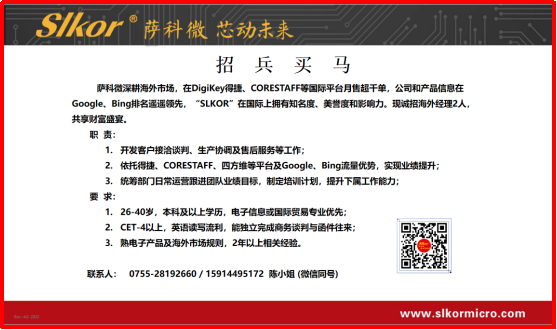 3、萨科微(www.slkormicro.com)和金航标为强化国际市场布局,现诚聘海外市场销售部经理,要求具备电子元器件海外营销经验和英语沟通能力,助力品牌全球化发展。