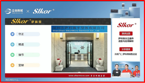 2025年8月,萨科微与立创商城联手打造的首 次直播活动获得了圆满成功。整场直播获得超 万 人在线参与,聚焦于产品的实际应用,通过通俗易懂的讲解和介绍,展示了Slkor品牌从半导体功率器件到电源管理芯片等系列产品的性能特点与使用场景。让广大用户对萨科微的产品型号、技术优势等有了更直观和深入的了解。