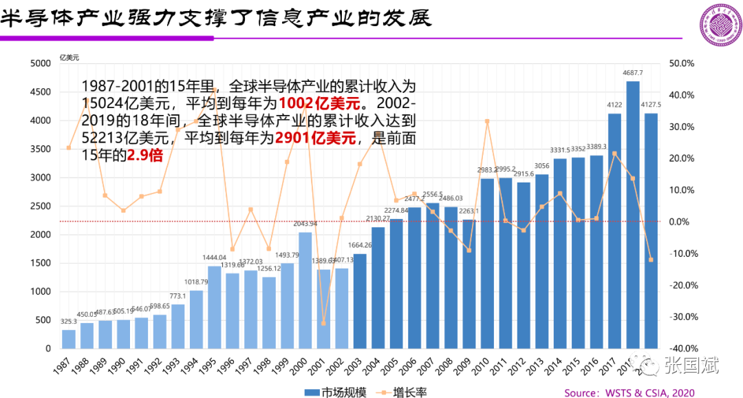 我们看到,标准的统一,形成了信息产业的大发展趋势,我们知道互联网造就了英特尔标准统一,移动通信,ARM+安卓、ARM+IOS形成另一种标准,这是全球化形成的大格局。半导体的作用应该是非常大,1987年到2001年,平均每年的产值1002亿,后面18年间,平均每年是2900亿,大概也是三倍。