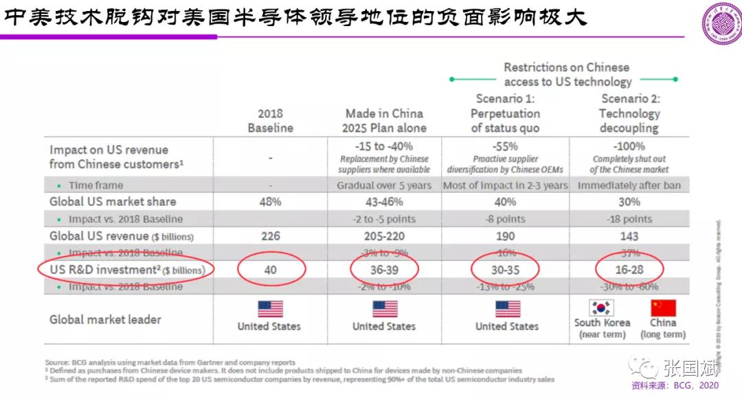 中美技术脱钩对美国半导体领导地位的影响非常大,今年美国的波士顿咨询集团,做过一个专门的研究,我把它的研究结果一波内容摘到这儿看一看。他们说如果只是中国制造2025的影响,中国制造2025我个人认为什么影响都没有,只是把地方政府戴了一个帽子,不知道为什么西方对它如此重视。即便如此,大概也就是下降1%到4%,但今天美国采取的措施,对它的影响会对它产生13%到20%左右的影响,而如果是技术上的脱钩,对美国的影响达到30%到60%,也就是它的研发是完全无法支撑的。因此,他们做了一个预测,短期内可能是韩国会成为半导体的领袖,长期看中国会成为半导体的领袖。中国能不能成为半导体领袖,不取决于我,而是取决于在座的各位能不能做到,我个人觉得可能还没那么快,需要很长时间。但是美国的同事们他们对这些问题的看法还是比较尖锐,眼睛还是比较独到的,看到这件事情。