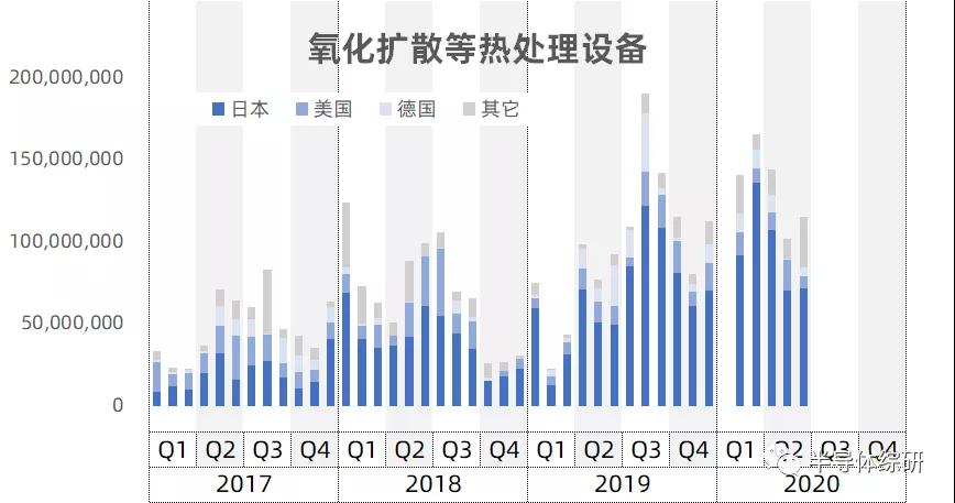 42个月,中国大陆进口氧化扩散等热处理设备约32.3亿美金。由图可见,从去年下半年开始,进口量金额大幅增加: