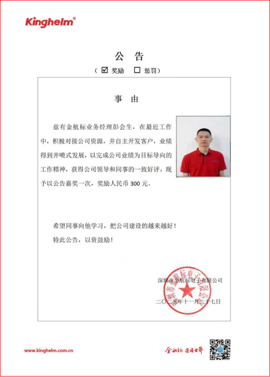 2025年12月01日到2025年12月06日,金航标(www.kinghelm.net)/萨科微(www.slkoric.com)“每周之星”经过同事们评比,获奖的是金航标业务助理黄意民,在最近一周