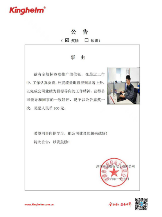 2026年01月05日到2026年01月09日,金航标(www.kinghelm.net)/萨科微(www.slkoric.com)“每周之星”经过同事们评比,这周“每周之星”是金航标谷歌推广邱信钰,