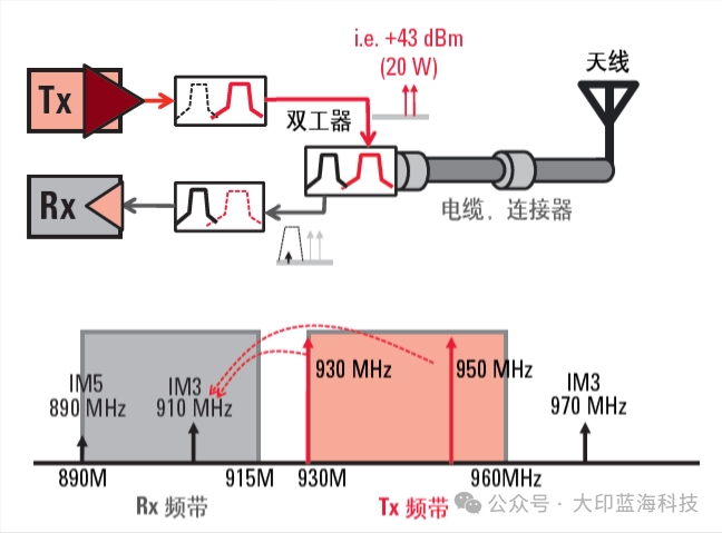 下图是一个无线通信系统前端设备的典型结构图。虽然通过滤波可以把信号发射路径中由功放产生的干扰信号去掉,但是射频信号路径中由无源器件 (天线、电缆或连接器) 引起的PIM干扰信号是无法滤掉的。信号发射(Tx) 通道中的 PIM干扰信号会进入信号接收(Rx) 通道,这会增加接收通道中的噪声功率从而降低无线通信的质量。因此要想保证整个无线通信系统的质量,就必须使用 PIM指标很低的无源器件,以满足通信系统的总体技术要求。