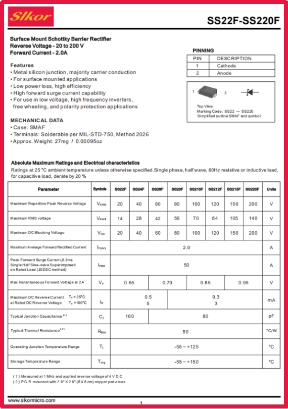 在新能源汽车充电桩的电流转换中,在工业机器人伺服系统的电源保护里,在户外LED显示屏抵御电压波动的防御机制中,一颗直径仅3mm的肖特基二极管正以“隐形卫士”的姿态,守护着电子系统的稳定运行。slkor萨科微推出的SS210F,凭借100V反向耐压与2A整流电流的突破性组合,重新定义了中高压场景下的电源管理标准,为工程师提供了更高效、更可靠的解决方案。