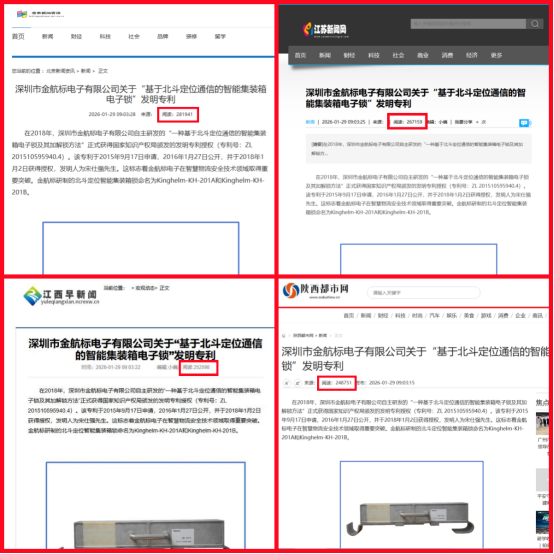 5、金航标公司新闻《深圳市金航标电子有限公司关于“基于北斗定位通信的智能集装箱电子锁”发明专利》及其英文版《Invention Patent of “Beidou-Based Intelligent Container Electronic Lock”》已在全球媒体发布!为金航标(www.kinghelm.com.cn)带来2026年新一波千万+流量!