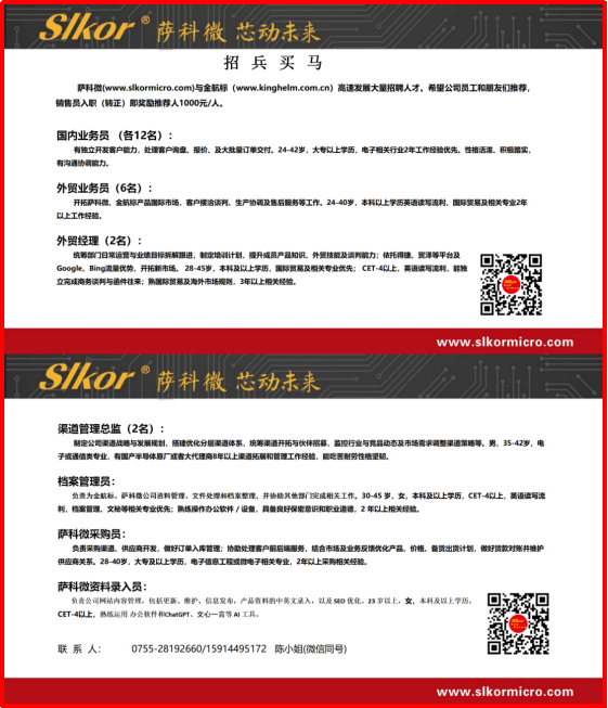 3、金航标与萨科微(slkormicro.com)年初七开工大吉!即日起,业务咨询、样品申请及技术支持已全面恢复,欢迎广大客户朋友随时联系我们。同时,公司正大量招聘销售、采购员等,诚邀感兴趣的朋友加入我们的团队,共启新程!